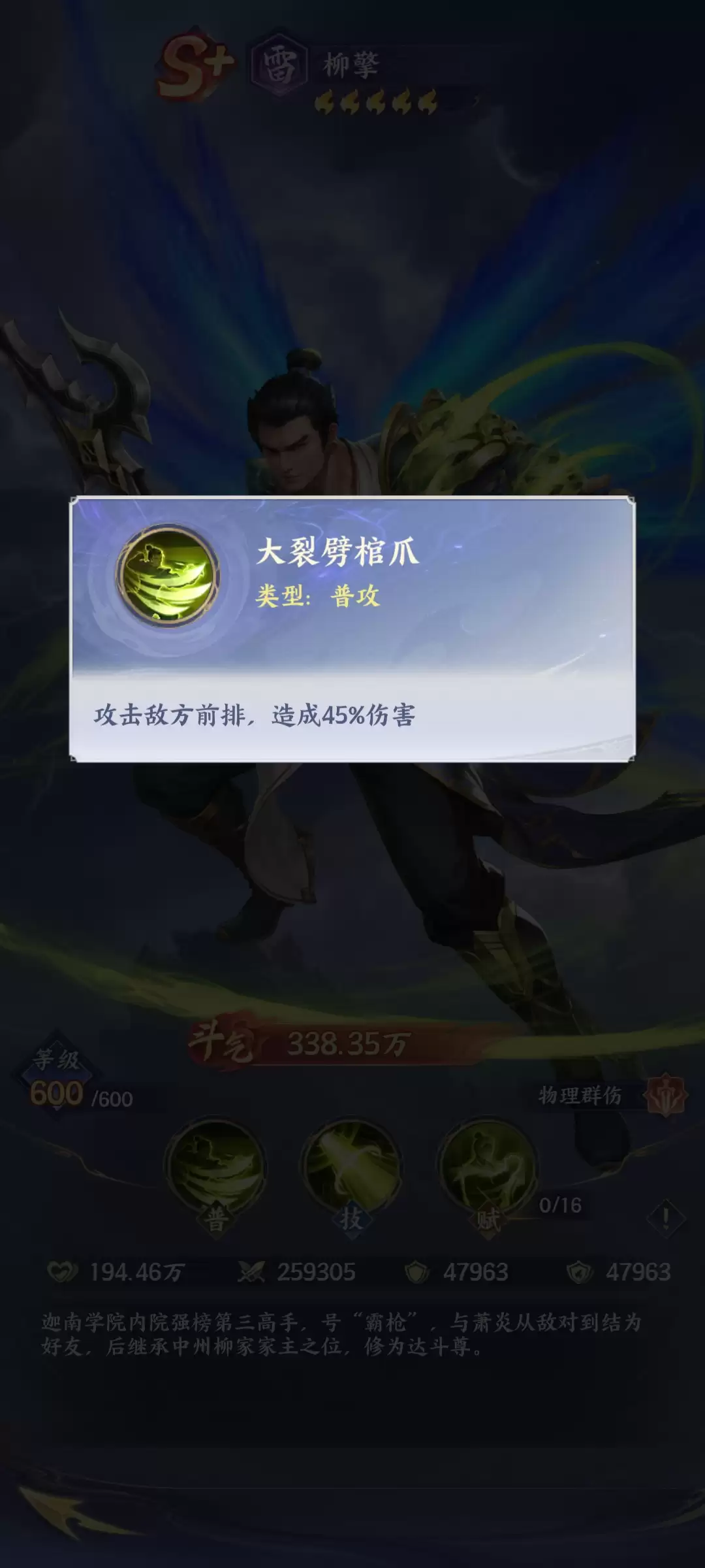 柳擎身穿蓝金色的服饰,搭配绿色的斗笠,身后还有蓝色的斗气羽翼。整体来看,他的实战能力颇为霸道。玩家在与他交手时,需要充分了解他的特点——例如他那充满毁灭性的力量。一旦施展普通攻击技能,他能有效地打击敌人的前排,在这种情况下能对敌人造成较高的物理伤害。虽然他的普通攻击技能看上去比较简单,但威力却不容小觑。