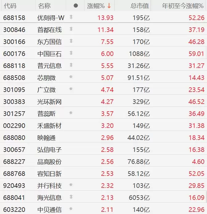 其中,优刻得-W涨幅近14%,首都在线飙升超11%,东方国信涨幅突破7%,中国巨石的股价也攀升了6%。普元信息、芯朋微均录得超过5%的涨幅,广立微和光环新网的股价同样表现不俗,双双上涨逾4%。