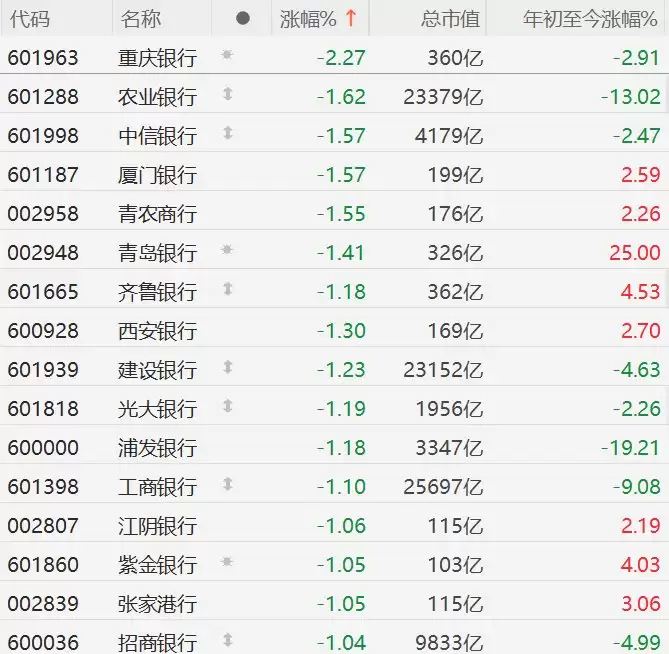 A股银行股普遍下行,重庆银行跌幅超2%解析