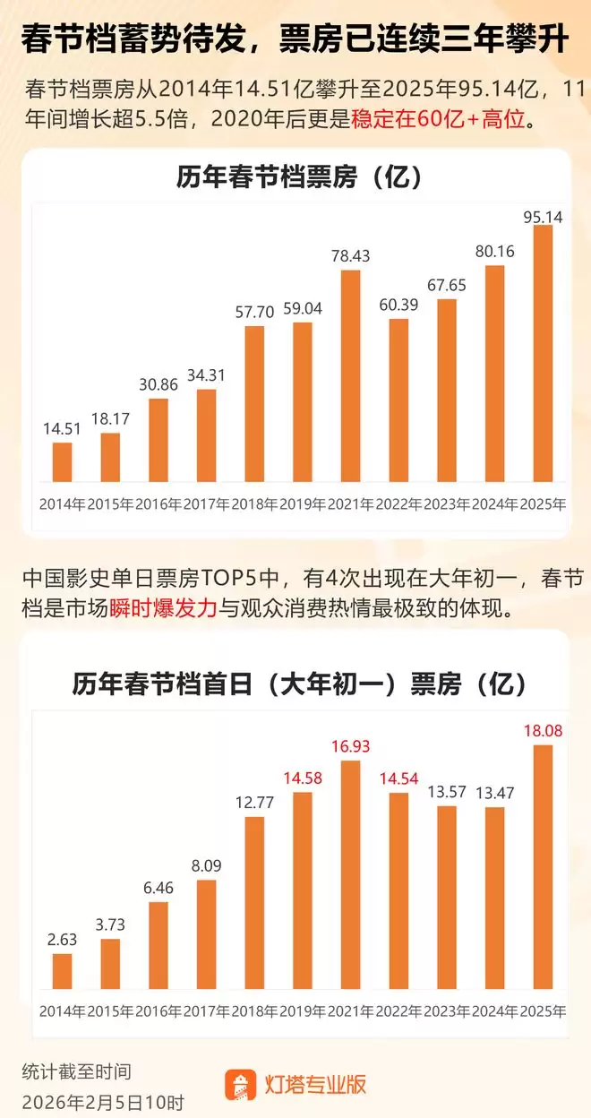 而春节档自2024年起,总票房就稳定在60亿高位基准线上,在并无变数的情况下,今年春节档并不会跌破这一基线。从以往数据来看,中国影史单日票房TOP5中,有四次出现在大年初一,而其中三次出现在疫情之后。