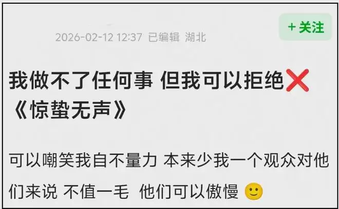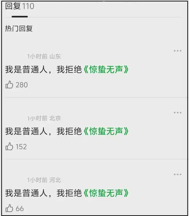 偏偏这时候还有影院站出来控诉《惊蛰无声》发行方干扰排片,随着影院当事人出面发声,已经有网友表示要抵制《惊蛰无声》,一条“我是普通人,我拒绝《惊蛰无声》”的帖子引发上百位网友跟帖。