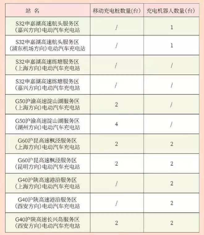 为方便新能源车车主充电,不少高速公路充电站点已配备移动充电桩或充电机器人,其中,G50沪渝高速淀山湖服务区(湖州方向)电动汽车充电站配备了4个移动充电桩;G50沪渝高速淀山湖服务区(上海方向)电动汽车充电站、G60沪昆高速枫泾服务区(上海方向+昆明方向)电动汽车充电站、G40沪陕高速长兴岛服务区(西安方向)电动汽车充电站,各配备了2个移动充电桩;G60沪昆高速枫泾服务区(上海方向+昆明方向)电动汽车充电站、G40沪陕高速港沿服务区(上海方向+西安方向)电动汽车充电站、G40沪陕高速长兴岛服务区(西安方向)电动汽车充电站,各配了2个充电机器人。