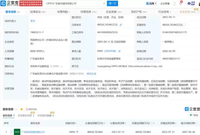 据企查查APP显示,近日,OPPO广东移动通信有限公司发生工商变更,段要辉卸任法定代表人、经理及董事职务,由李杰接任。企查查信息显示,该公司成立于2003年4月,注册资本约4.9亿元,经营范围涵盖移动终端设备制造、移动终端设备销售、软件开发等,由广东欧加控股有限公司全资持股。
