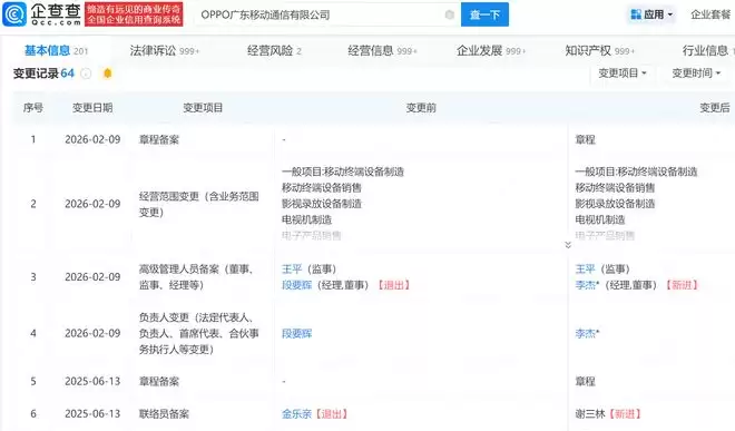 OPPO高管变更:李杰接任法定代表人,公司治理新布局