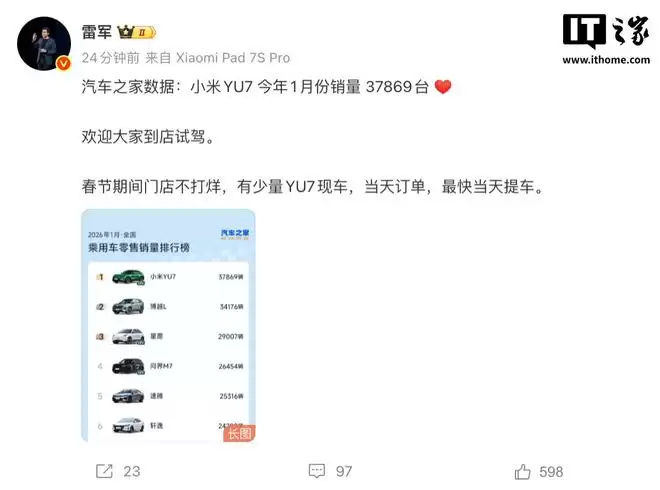 据IT之家2月12日消息,今天下午,小米创始人、董事长兼CEO雷军在微博转发“汽车之家”发布的数据称,小米YU7车型在今年1月份的销量达到37869台。雷军进一步透露,小米汽车在春节期间门店不打烊,备有少量YU7现车,当天订车,最快当天即可提走。