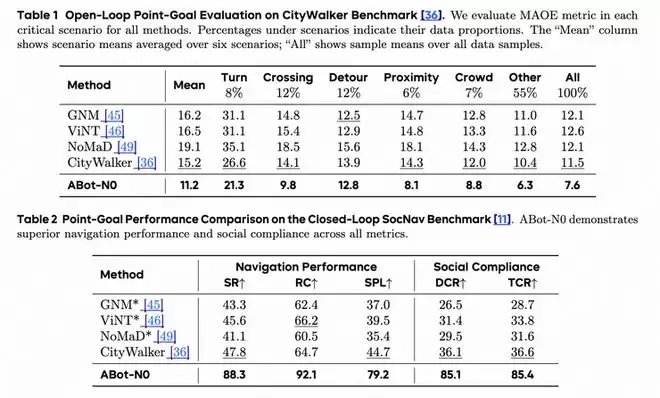 基于ABot-N0的系统性创新,其在CityWalker、SocNav、R2R-CE/RxR-CE、HM3D-OVON、BridgeNav、EVT-Bench七大权威基准测试中全面刷新了世界纪录。其中在SocNav闭环仿真中,成功率(SR)飙升40.5%,在HM3D-OVON评测中成功率(SR)提升8.8%,均显著强于之前的SOTA模型。