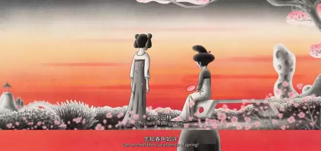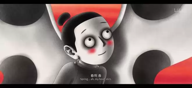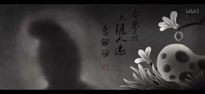 屏风之上写的“春梦短,天涯人远意匆匆”,与唐寅(唐伯虎)的《杏花图》有关,原句为“香雪一庭春梦短,天涯人远意匆匆”。动画对此进行截取,是为了用这些字来暗示书生的命运,也是高度浓缩整个故事的引子。