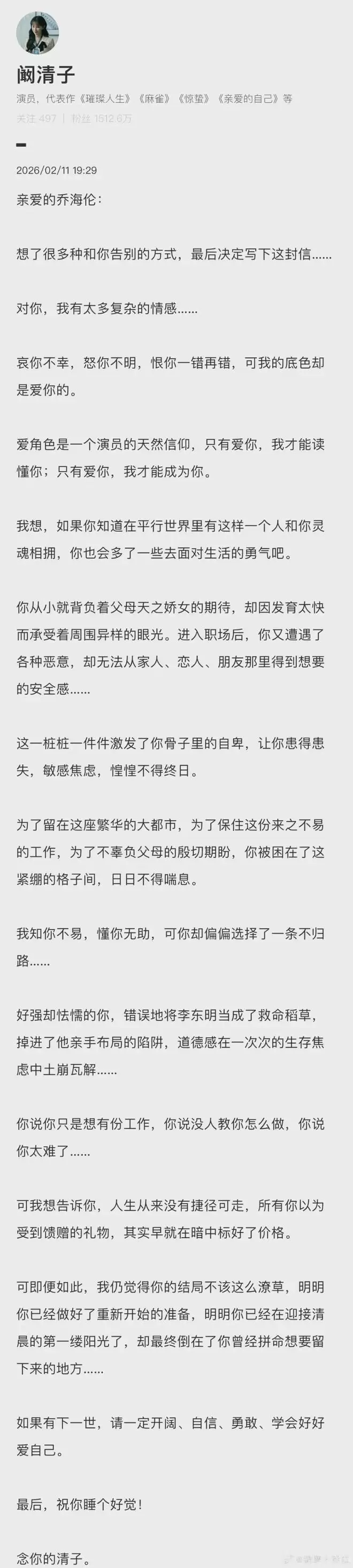 阚清子发了一篇长文告别角色乔海伦,她在文中直白地说,对乔海伦的情感特别复杂,哀其不幸,怒其不明,恨她一错再错,但心底里又满是心疼和爱意。