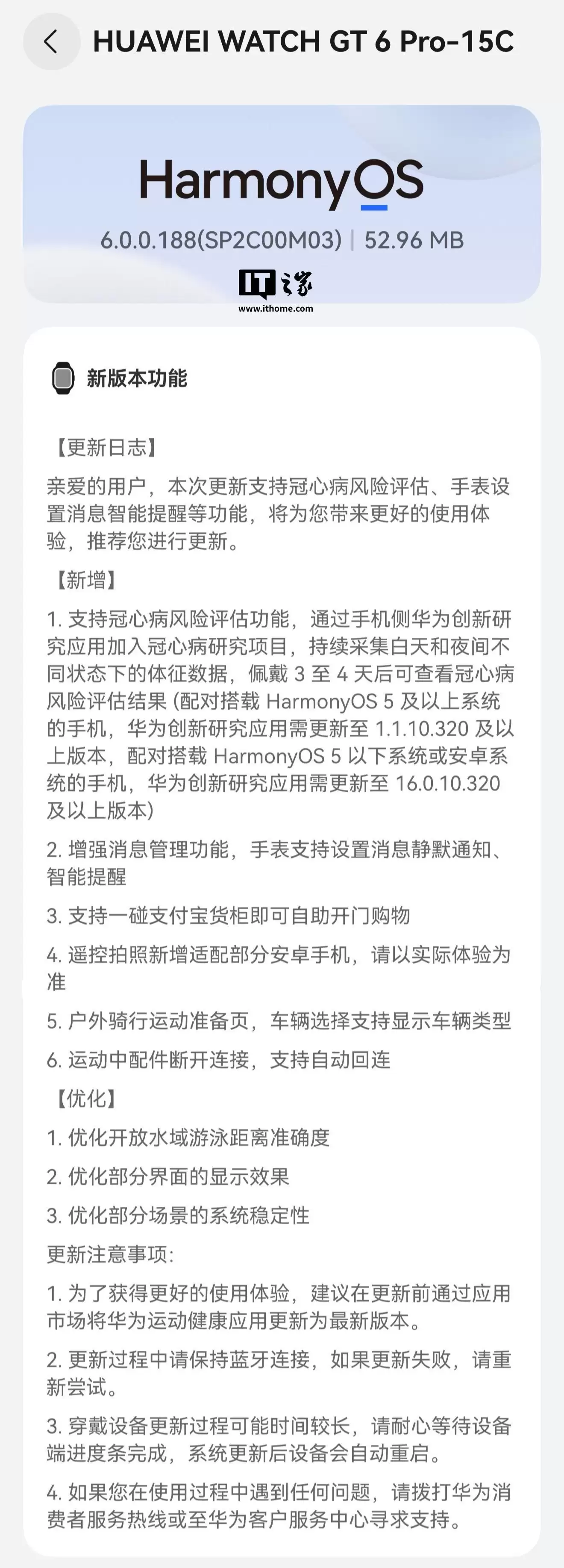 IT之家 2 月 12 日消息,华为 WATCH GT 6 系列智能手表近日迎来了鸿蒙 HarmonyOS 6.0.0.188 版本的系统更新。据悉,这次更新重点强化了消息管理功能,同时针对部分运动场景的使用体验进行了优化。此外,Pro 版本还新增了对冠心病风险评估功能的支持。