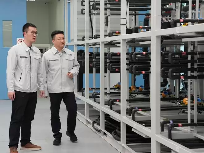 1月27日,张帆(左二)在调研液流电池平台的研发情况。新华社记者 刘颖 摄