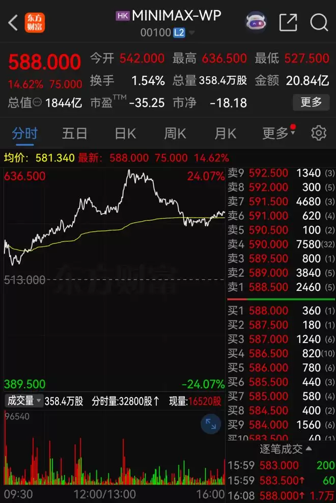 2月12日盘中,MiniMax与智谱的股价均出现大幅上涨。其中,MiniMax的市值一度接近2000亿港元。截至当日收盘,MiniMax股价上涨至588港元/股,涨幅达14.62%,总市值达到1844亿港元。