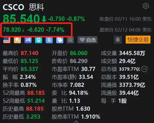 2月12日,芯片巨头思科(CSCO.US)在盘前交易中大跌7.74%,报价触及78.92美元。