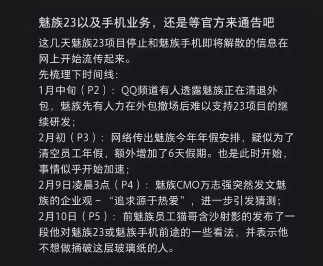 但近期社交平台上关于该项目研发终止、手机业务解散的爆料却并非空穴来风,即使魅族没有回应,但第三方的消息却很多。
