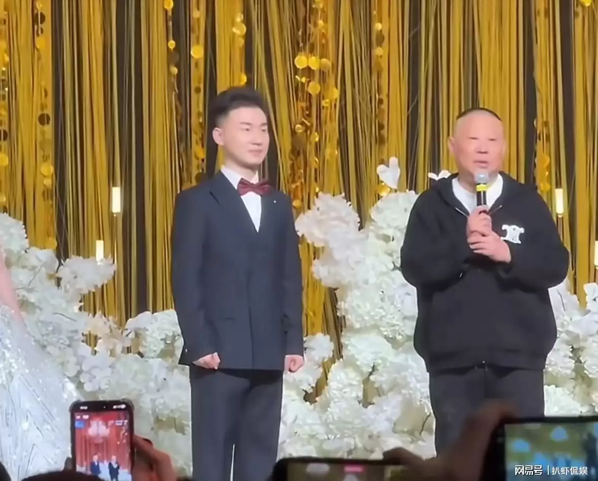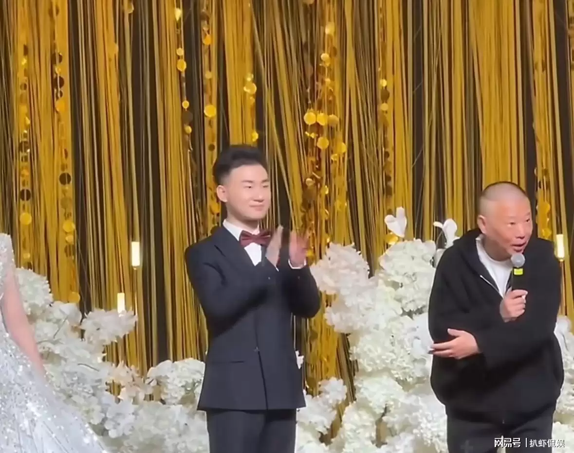 郭麒麟接过话筒后,简单向师弟表达了祝福。虽然平日里在舞台上表演时能说会道,但到了婚礼现场,他却有些词穷,显然没准备这一环节。