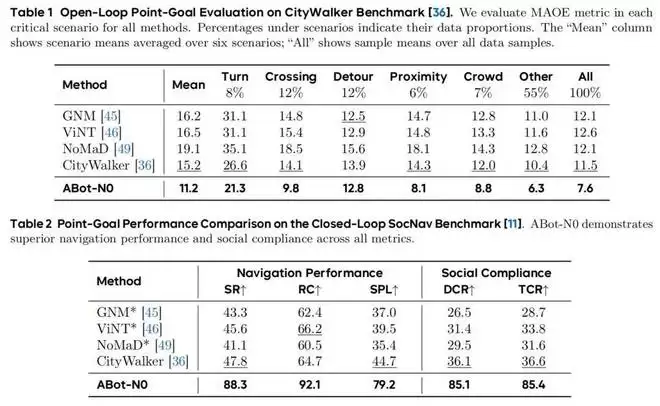 评测结果是,其在 CityWalker、SocNav、R2R-CE/RxR-CE、HM3D-OVON、BridgeNav、EVT-Bench七大权威基准测试中全面刷新了纪录。其中 SocNav 成功率提升 40.5%,HM3D-OVON 物体导航成功率提升 8.8%。SocNav 这个方向尤其值得关注,机器人在有人的动态环境里安全、自然地移动,是服务机器人规模化商用的必要前提,之前一直是这个领域的硬骨头。