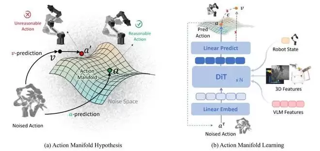 算法层面,ABot-M0 提出了AML(Action Manifold Learning,动作流形学习)。这个方法背后有一个直觉上成立的假设:真实有效的机器人动作,并不是随机分布在所有可能的动作空间里,而是集中在一个受物理规律和任务约束共同塑造的低维流形上。在这个流形上学习,比在全空间暴力搜索更高效,生成的动作序列也更符合物理规律、更稳定。