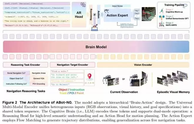 在技术实现上,ABot-N0 打破了传统的任务隔离方法,采用层次化的「大脑 - 动作」设计哲学。