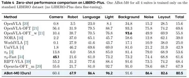 效果上,在 Libero、Libero-Plus、RoboCasa 基准测试中,ABot-M0 在包含复杂任务组合与动态场景扰动的设定下,平均任务成功率均达到 SOTA。在高难度的 Libero-Plus 基准上,ABot-M0 达到了80.5%的任务成功率,比此前最强方案 pi0提升近 30%。这个提升幅度在工程上是有意义的,从 50% 到 65% 可能只是参数调整,从 50% 到 80% 意味着系统性的能力跃升。