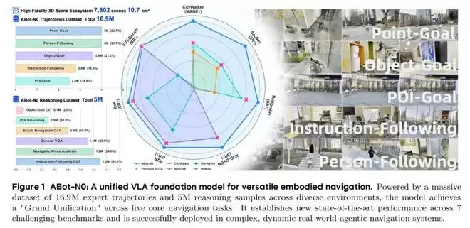 ABot-N0 的做法是全任务一统:在单一 VLA(视觉 - 语言 - 动作)架构内,实现五大核心导航任务的「大一统」