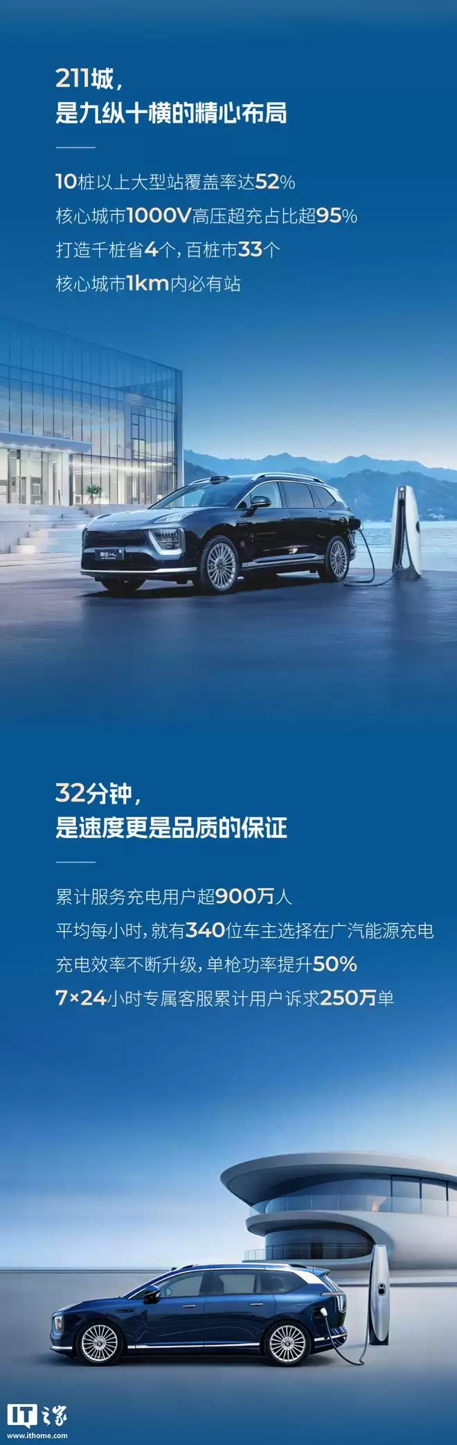 在站点布局方面,广汽10桩以上大型充电站覆盖率已达52%,核心城市1000V高压超充占比超过95%。目前已在4个省份实现"千桩省"布局,33个城市达成"百桩市"目标,核心城区1公里范围内均设有充电站点。