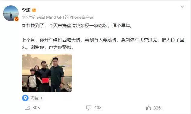 今天下午,他在微博发文:春节快到了,今天来海盐请姚东权一家吃饭,拜个早年。上个月,你开车经过西塘大桥,看到有人要跳桥,急刹停车飞奔过去,把人拉了回来。谢谢你,也为你骄傲。