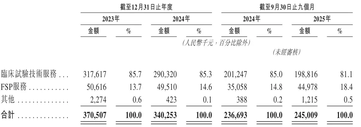 从收入构成来看,2025年前九个月,博纳西亚的临床试验技术服务收入为2亿元,占总收入的81.1%;FSP服务收入为4498万元,占比为18.4%。