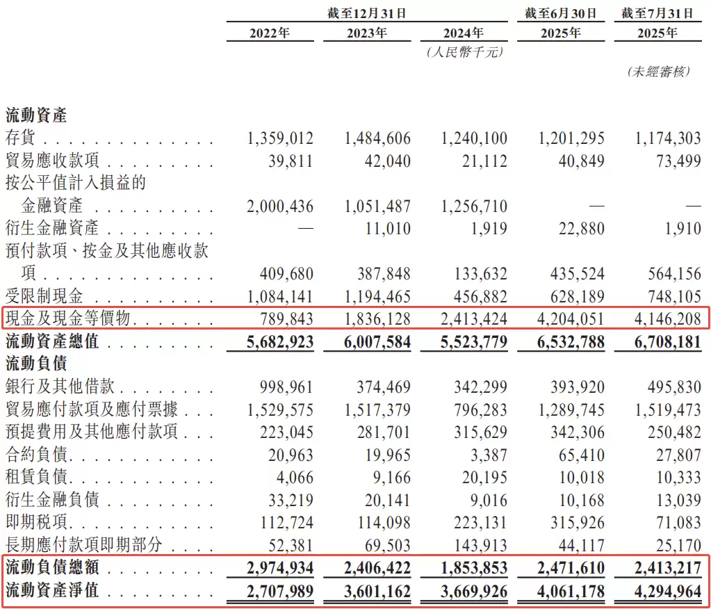 截至2025年7月31日,公司的现金及等价物为41.4亿元。同时,公司负债水平维持在较低位置,流动负债总额为24.1亿元,流动负债净额为42.9亿元。