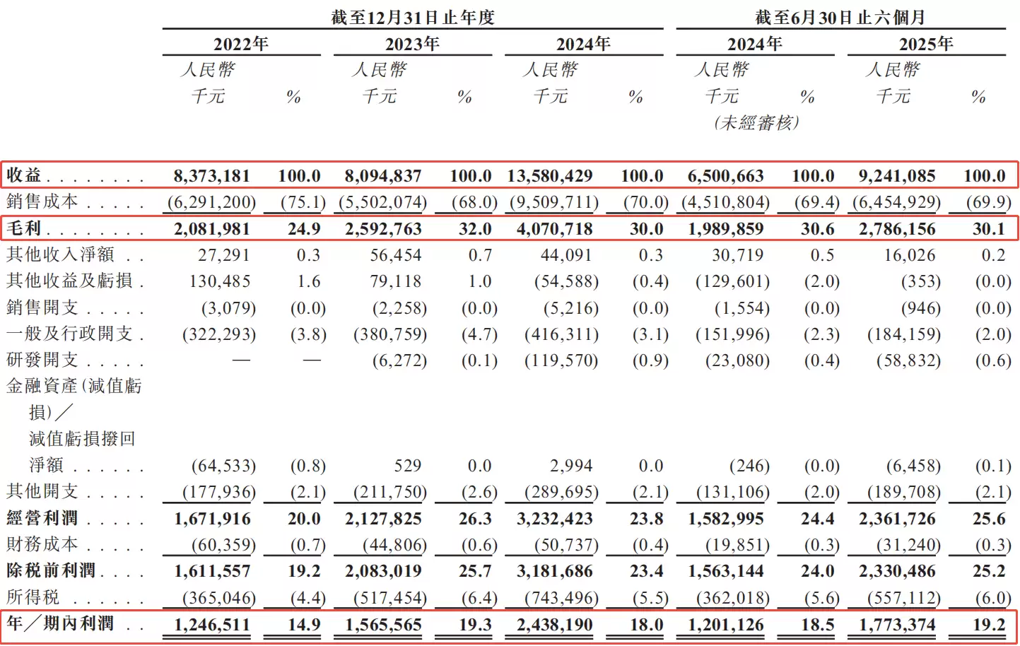 公司的毛利增速更为显著,2022年至2024年,毛利分别为20.8亿元、25.9亿元及40.7亿元,复合年增长率为39.8%,对应毛利率分别为24.9%、32.0%及30.0%。2025年上半年,毛利达到27.8亿元,同比增长40.0%,对应毛利率为30.1%。