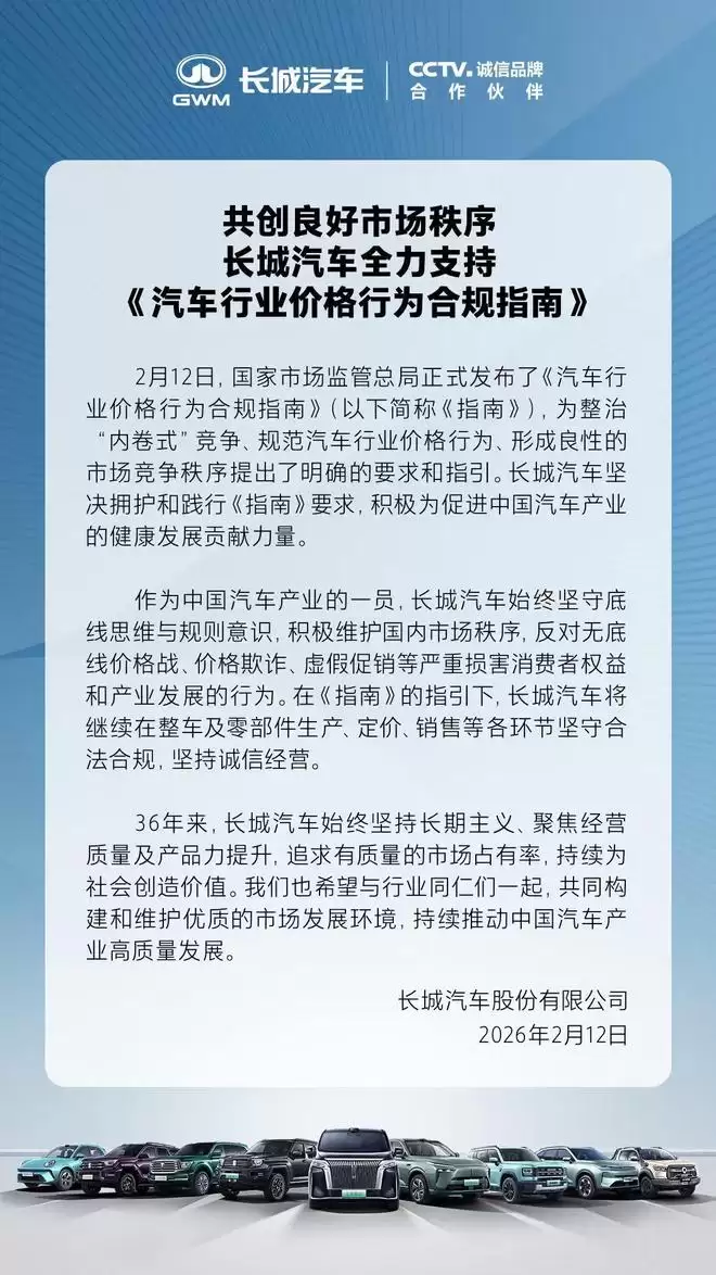 2月12日,IT之家发布消息称,长城汽车于今晚宣布全力支持《汽车行业价格行为合规指南》,始终秉持长期主义原则,恪守法律法规,坚持诚信经营,积极维护国内市场秩序。长城汽车同时呼吁行业同仁携手合作,共同构建并维护优质的市场发展环境,持续推进中国汽车产业实现高质量发展。