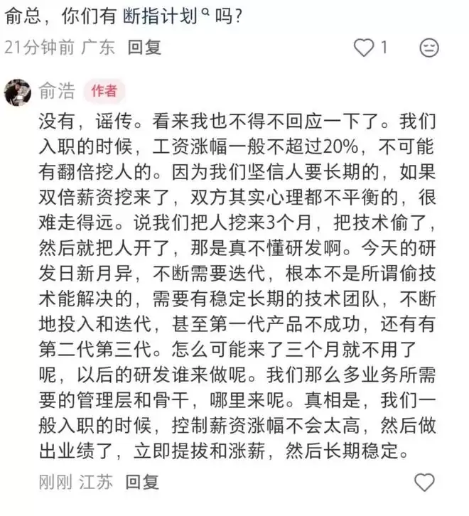俞浩同时强调,追觅需要的是稳定长期的技术团队,员工入职时的工资涨幅一般不超过20%,做出业绩后会立即提拔涨薪。