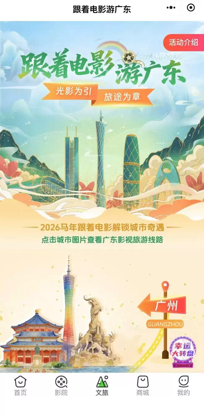 从2月4日至3月3日,珠影通线上平台设立了专门的“跟着电影游广东”专题入口,集中展示了广东省 21 个地市精选的 60 条文旅线路。这些线路涵盖了历史文化、自然风光、亲子乐园、乡村体验、城市漫游等多种类型,充分展现了广东丰富的旅游资源。