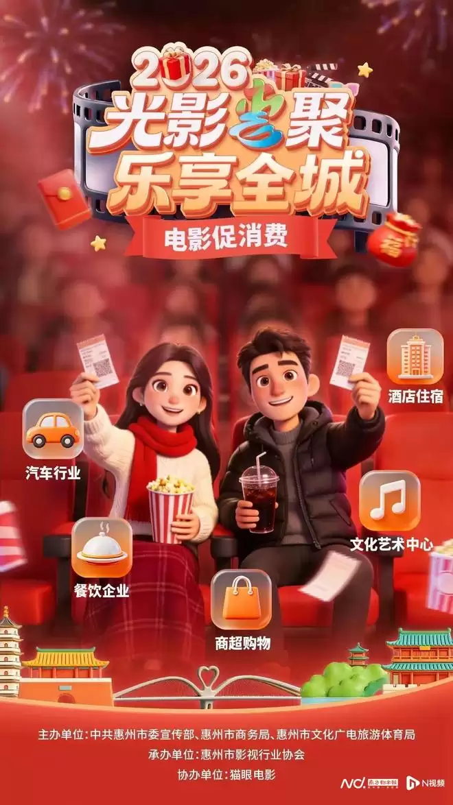 惠州市开展的 2026“光影惠聚 乐享全程”电影促消费活动,实现了电影与零售、餐饮、住宿、旅游等多个行业的深度联动。活动期间,消费者在指定影院观影后,可获得涵盖多个行业的消费优惠券大礼包;同时,在指定商家消费达到一定金额,也可获得免费电影票或观影折扣券。这种多赢的合作模式,不仅惠及了广大消费者,也带动了相关行业的共同发展。