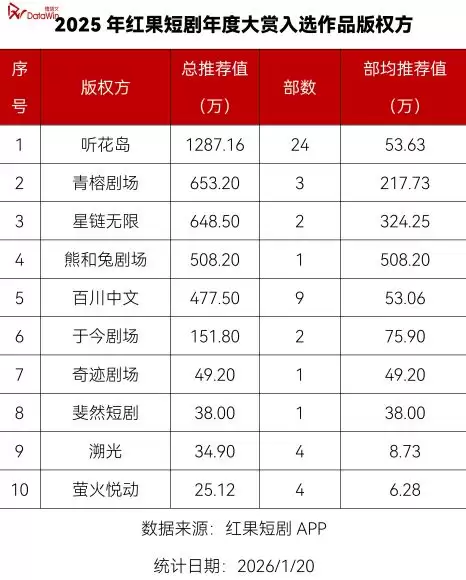 榜单中后段的部分版权方,虽有多部作品入围,但部均推荐值偏低。在增量时代,“广撒网”是有效策略;但在存量博弈时代,低效产能将首先被出清。没有爆款能力支撑的规模化,是最危险的生存姿态。