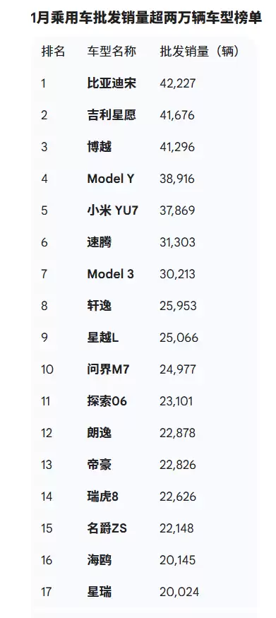 2026年1月车市销量:比亚迪宋领跑,新能源车型主导市场