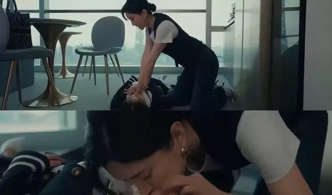 其中一场戏尤为震撼:乔海伦被李东明当众羞辱后跌坐在地,第一反应不是争辩或哭泣,而是下意识拉住滑落的裙摆,嘴角努力上扬维持体面,眼眶却迅速泛起血丝,手指关节因紧绷而微微发白,连指甲盖都透着青白。