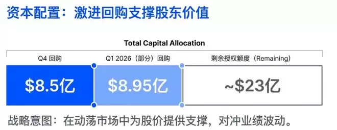 继Q4回购8.5亿美元股票后,公司在2026年初至2月10日期间又回购了8.95亿美元股票。加上董事会新批准的20亿美元回购授权,Coinbase目前仍有约23亿美元的回购“弹药”。
