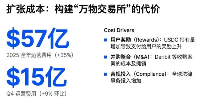 一是随着USDC持有量增加,支付给用户的奖励支出大幅上升;二是收购Deribit等公司带来的并购相关成本及摊销;三是全球合规及法律事务的投入。