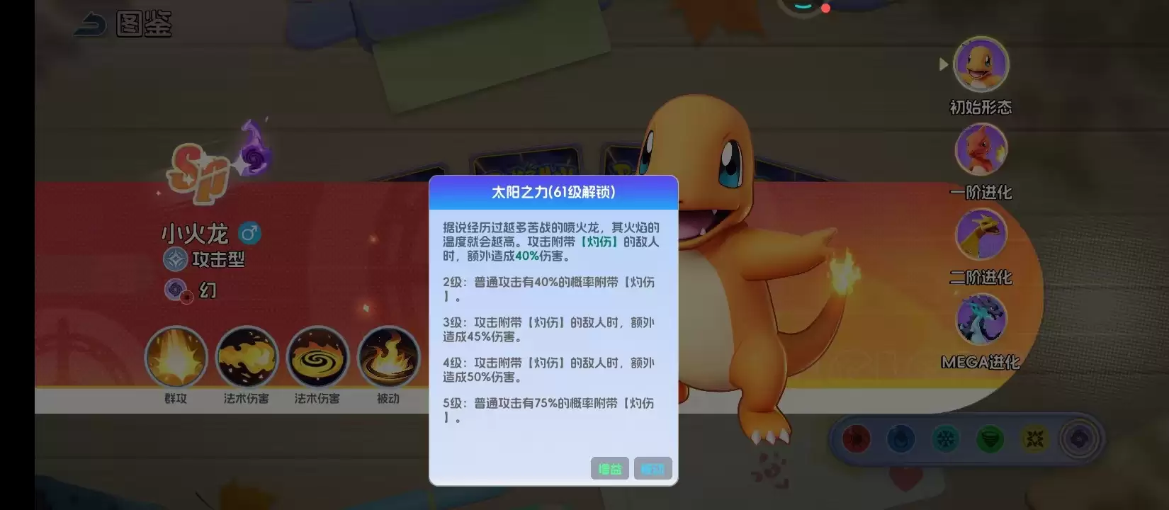 61级解锁的被动技能太阳之力成为终极杀招。让小火龙在攻击附带灼伤的敌人时,可以额外造成40%伤害,随着技能升级,这个加成最高可达50%。同时普攻附带灼伤的概率也会提升至75%,这意味着小火龙的技能在给敌人叠满灼伤之后,每一次普通攻击都会成为致命一击。原本的持续伤害技能也会瞬间转化为多重优势。