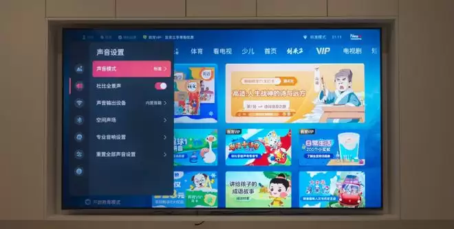 我们还可以在设置中根据自己所看的内容调整声音模式,包括影院、音乐、体育、新闻等。而且追觅Aura Mini LED 4K AI电视V3000持杜比全景声,电影中不同角色的对话声、脚步声都更真实。不需要额外连接音响,就能满足家庭影音需求。