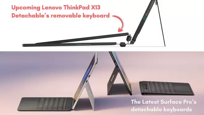 键盘设计上,与微软Surface Pro的平面连接方式不同,X13 Detachable的磁吸键盘采用独特的倾斜结构。