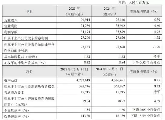 2月13日,华夏银行发布了2025年度业绩快报。数据显示,报告期内,集团实现利润总额341.74亿元,较上年下降4.75%;实现归属于上市公司股东的净利润272.00亿元,同比下降1.72%。资产总额47,376.19亿元,较上年末增长8.25%;贷款总额25,666.66亿元,比上年末增长8.47%。负债总额43,378.19亿元,较上年末增长8.15%;存款总额23,816.99亿元,比上年末增长10.71%。