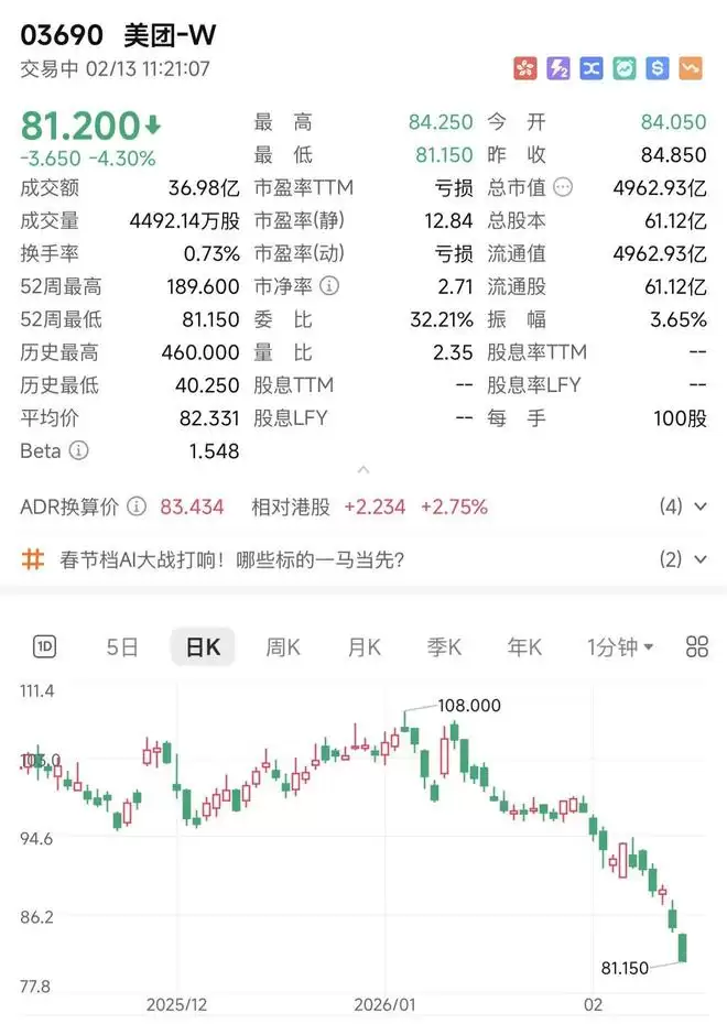 2月13日,美团股价持续下探,午间交易时段跌至81.200港元,跌幅达4.30%,盘中最低触及81.150港元。公司总市值随之跌破5000亿港元大关,降至4962.93亿港元,成交额约36.98亿港元。