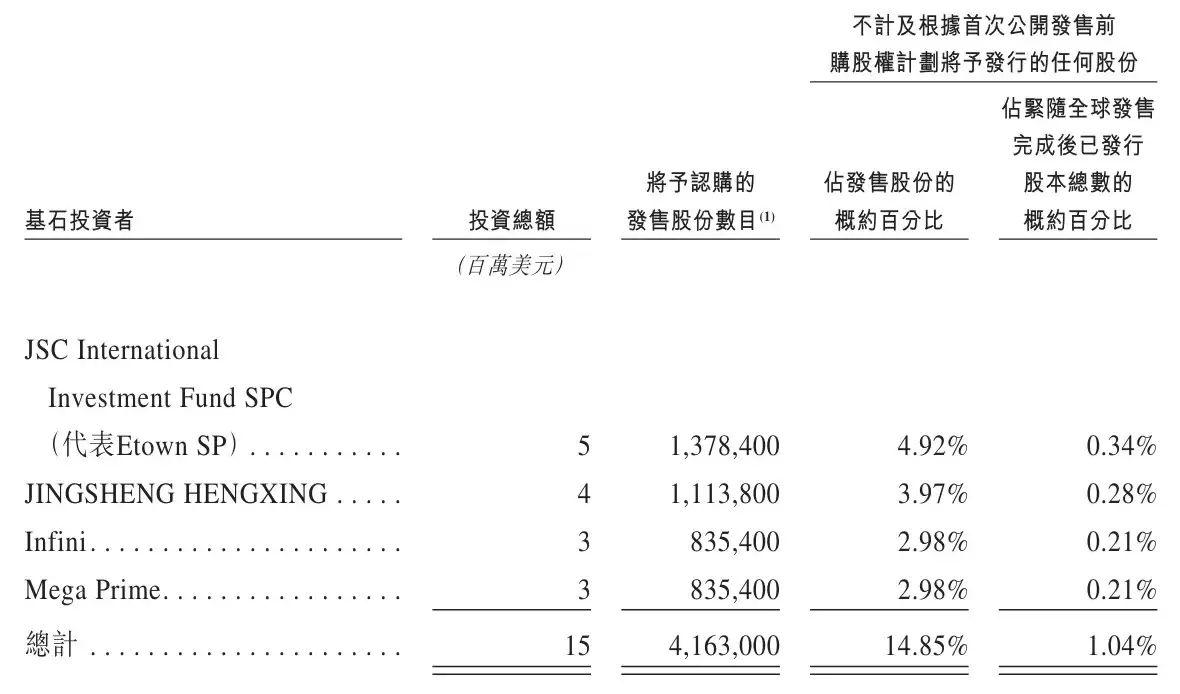 参与海致科技基石投资的机构阵容强大,包括北京金融控股集团有限公司旗下的JSC International、智谱旗下的JINGSHENG HENGXING、无极资本Infini以及大湾区共同家园投资有限公司旗下的Mega Prime,四家机构合计认购1500万美元。