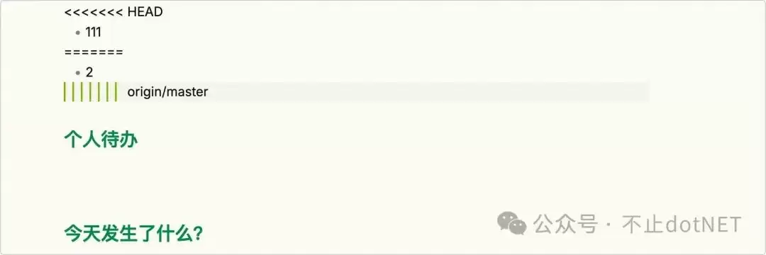 4. 尽量不要在没有提交推送的情况下同时在 PC 端和移动端修改同一个文件,否则会出现冲突。解决冲突的方式和写代码时完全一致。比如下图就是出现冲突时的显示,将冲突部分修改为最终版本提交推送即可