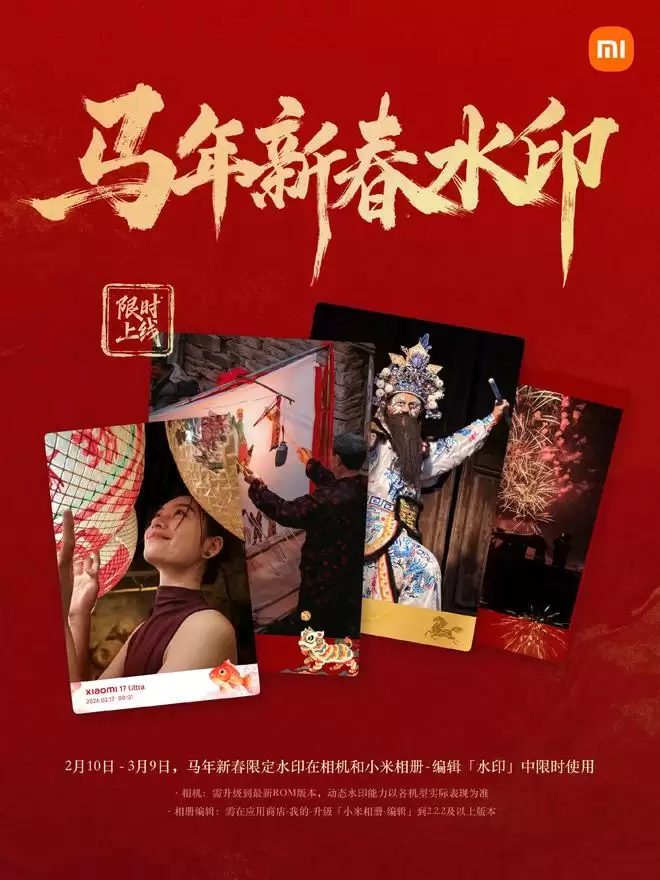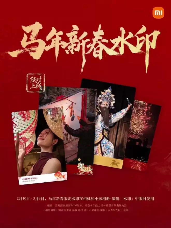 IT之家2月13日消息,继2026年元旦水印之后,小米相机部产品经理@Bao_小李宣布为澎湃OS 3系统推出三款2026年马年新春限定水印,用户可在2026年2月10日至3月9日期间使用。