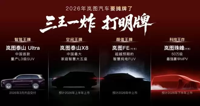 其中,“智驾王牌”岚图泰山Ultra搭载华为乾崑智驾 ADS 4 四激光方案,岚图泰山Ultra和岚图泰山黑武士将于2026年3月正式登场;“空间王牌”岚图泰山X8,空间5200×2025×1814mm,预计2026年上半年上市;