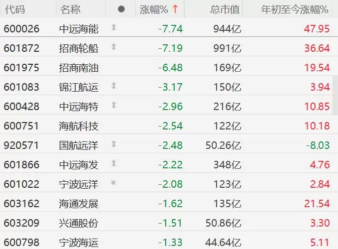 A股航运股普跌:中远海能、招商轮船跌幅超7%
