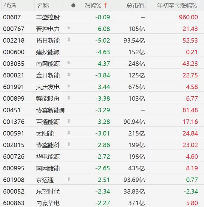 A股市场电力股普遍下跌,其中,丰盛控股跌8%,晋控电力跌6%,拓日新能跌5%,建投能源、南网能源跌超4%,金开新能、大唐发电、赣能股份、百通能源跌超3%。