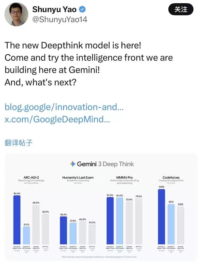 值得一提的是,去年9月加入谷歌DeepMind团队的清华物理系知名学者姚顺宇(Shunyu Yao)也深度参与了此次DeepThink新模型的研发工作,并在当天通过社交媒体发文,邀请广大用户体验这一全新模型。