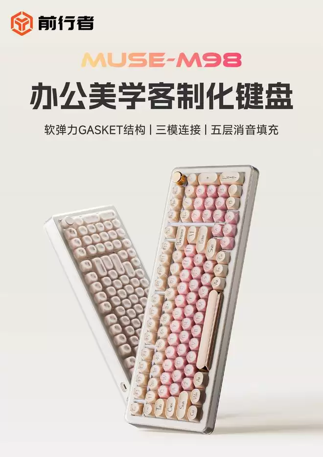 IT之家2月13日讯,科技品牌前行者(EWEADN)此前预热的三模机械键盘MUSE M98现已提前上市。这款产品采用“办公美学”设计理念,提供“粉底液”(采用MDA高度拼色PC键帽)与“颜如玉”(类陶瓷质感键帽)两种键帽版本可选,全系售价499元。